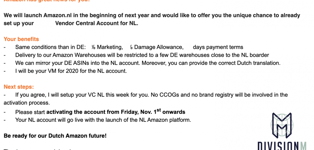Dat gaat dus eindelijk veranderen. Nederlandse leveranciers (vendors) en verkopers (sellers) kunnen alvast een zogeheten Central Account voor Nederland aanmaken, zoals blijkt uit onderstaande mededeling.