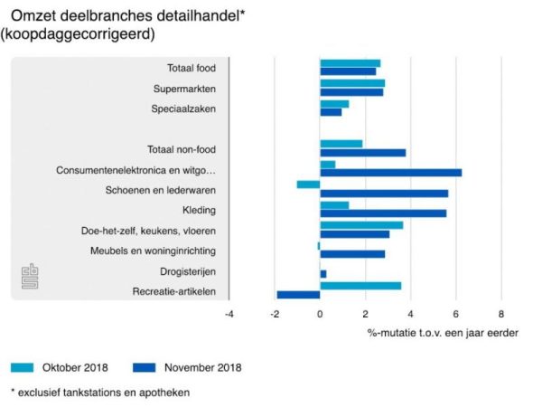 De winkels in voedings- en genotmiddelen hebben in november 2,5 procent meer omgezet dan in november 2017. Het verkoopvolume groeide met 1 procent. De omzetstijging van de supermarkten (2,8 procent) was groter dan die van de speciaalzaken (1 procent).