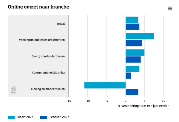 Verder meldde het CBS dat er online ruim 3 procent meer werd omgezet. Webwinkels die alleen online verkopen zagen de omzet met dik 9 procent stijgen, maar winkels die zowel fysiek als online verkopen lieten een omzetdaling zien van 4,2 procent. De online-omzet van winkels in voedingsmiddelen en drogisterijen, winkels in overige non-foodartikelen en consumentenelektronica nam in maart toe.