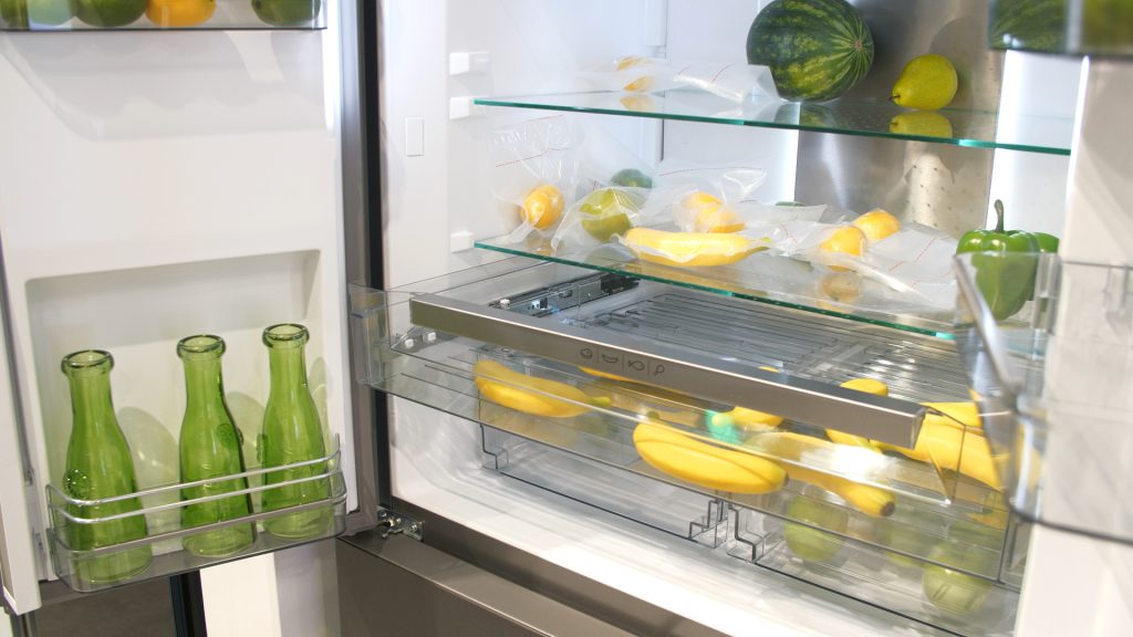 Bijzonder is ook een nieuwe koelkast met vacuumtechnologie. Een apart gedeelte aan de voorkant van de koelkast kan gebruikt worden voor – het woord zegt het eigenlijk al – het vacuum verpakken van bijvoorbeeld fruit. Sharp claimt dat bepaald voedsel op die manier tot wel acht keer langer mee kan. De koelkast is vanaf volgend jaar januari leverbaar.