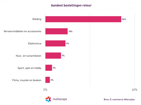 Kleding, schoenen en modeaccessoires stuurde men het vaakst terug. Een derde (34%) van de bestellingen in deze categorie ging gedeeltelijk of geheel retour. Vervoermiddelen en accessoires werden in 10% van de gevallen teruggestuurd. Elektronica (9%) en huis- en tuinartikelen (7%) volgen.