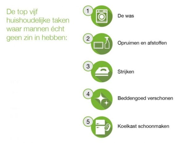 Er is zelfs een compleet persbericht aan gewijd. Hierin lezen we dat bovenaan het lijstje van de meest vervelende huishoudelijke taken van mannen ‘basics’ staan, zoals de was doen (76%), opruimen en afstoffen (60%) en strijken (57%).