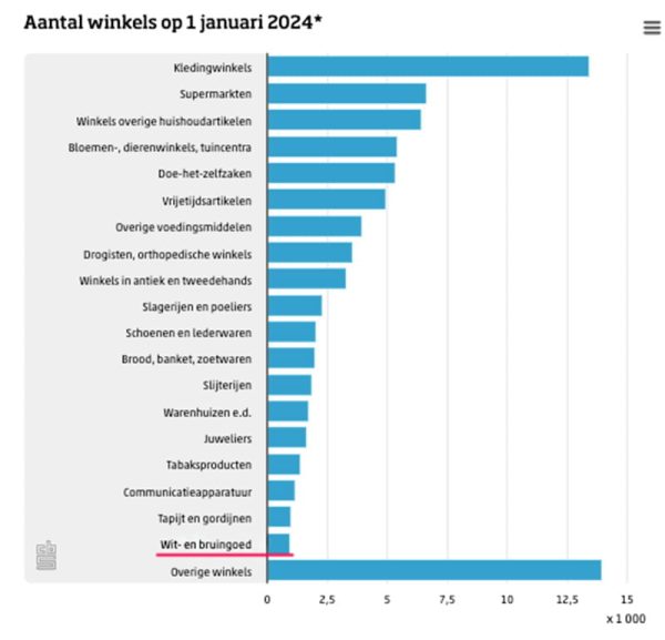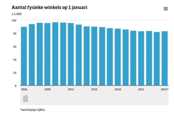 Op 1 januari 2024 telde Nederland ruim 83 duizend fysieke winkels. Dat zijn er 1,1 duizend meer dan vorig jaar, zo’n 1,3 procent. Hiermee wordt de dalende trend van het afgelopen decennium onderbroken. Het aantal elektroretailers daalde wel: winkels in wit- en bruingoed en audio- en video-opnamen verdwenen relatief het meest in 2023, maar een stuk minder sterk dan het jaar daarvoor toen beide met circa 7,5 procent afnamen. Dat meldt het CBS.