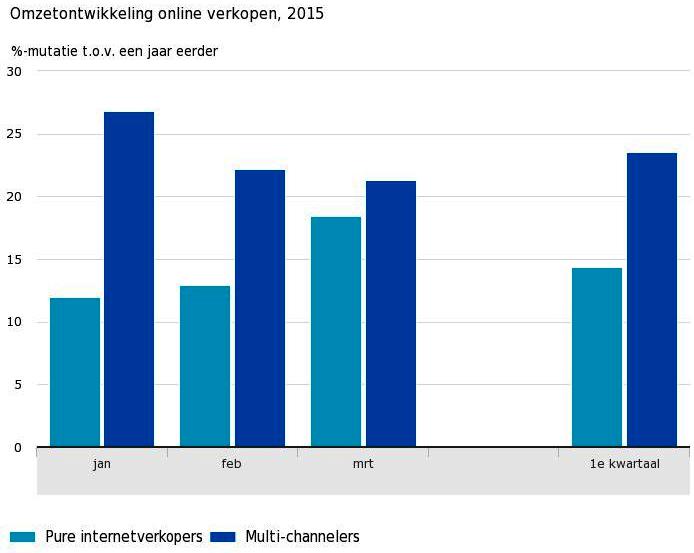 Op het e-commerce vlak bracht het CBS tot op heden alleen de groei van Nederlandse retailers ‘via postorder en internet’ in kaart, van partijen dus die primair op afstand verkopen. Voor het eerst geeft het bureau nu ook een indicatie van de digitale ontwikkeling van bedrijven die niet primair, maar tevens online verkopen. De e-commerce omzet van deze ‘multi-channelers’ (10 werknemers of meer) blijkt harder toe te nemen dan die van ‘pure internetverkopers’.