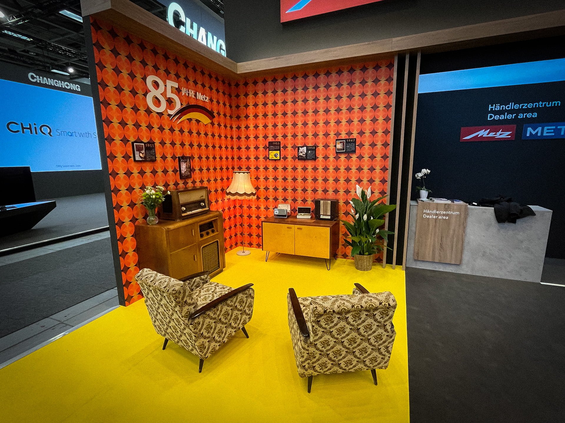 Dus toen we in een gigantische ruimte Metz tegenkwamen waren we best geïntrigeerd. Dat kwam vooral door de vele retro-aspecten die waren verwerkt in de stand. Metz, opgericht in 1938 in Duitsland, wil graag laten merken dat het al bijna een eeuw bestaat. Oude tv’s, radio’s – stuk voor stuk waren ze prominent aanwezig op IFA, om de vele OLED-tv’s en andere moderne apparatuur te omlijsten. Meest in het oog sprong een televisie uit 1997, die was voorzien van een blauwe behuizing.