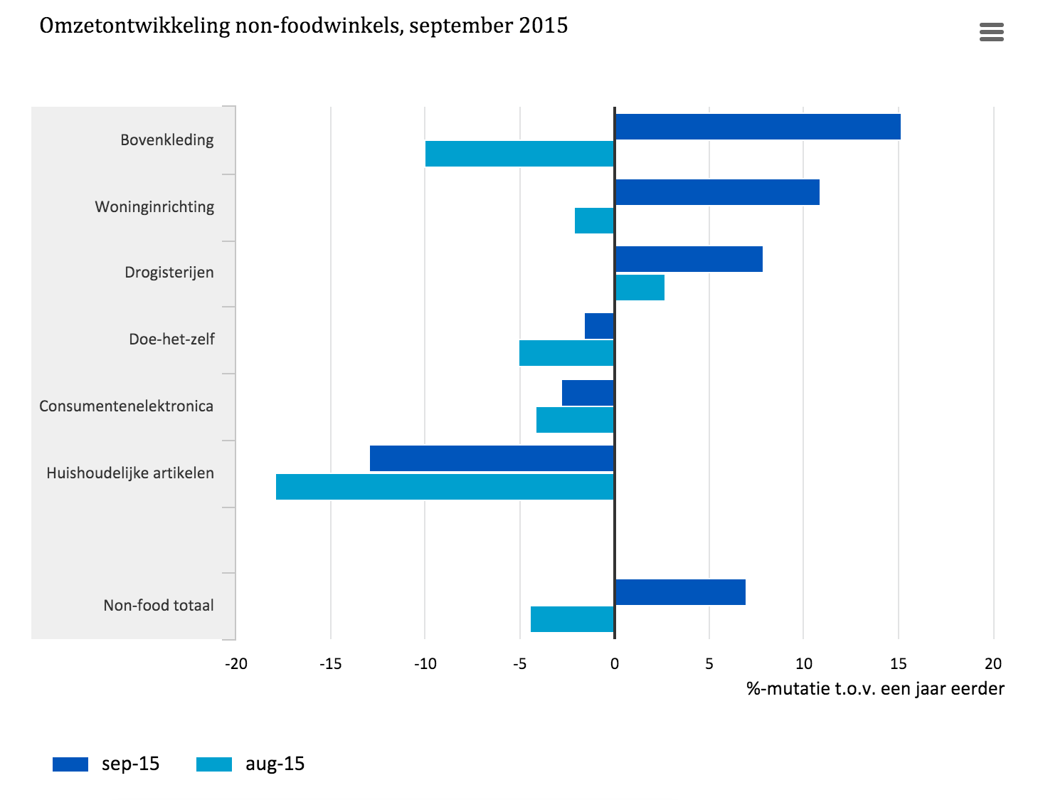 ‘Omzet detailhandel groeit behoorlijk’, aldus het CBS vanochtend over de Nederlandse detailhandelsbestedingen. Ze namen over alle kanalen met 4,3 procent toe. Het volume lag 5,1 procent hoger dan in september 2014, de prijzen 0,8 procent lager. Winkeliers in non-food boerden beter dan hun food-collega’s. Kledingwinkels spannen de kroon, met ruim 15 procent groei. Dat zou deels samenhangen met het weer en de gunstige kalender (meer ‘koopdagen’ dan vorig jaar in september).