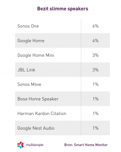 Zes procent van de Nederlanders heeft een Sonos One smart speaker in zijn of haar bezit. Dit komt neer op meer dan 450.000 huishoudens. Hiermee staat het product op de eerste plaats als het gaat om slimme speakers. De Google Home (4%) en de Google Home Mini (3%) maken de top drie compleet.