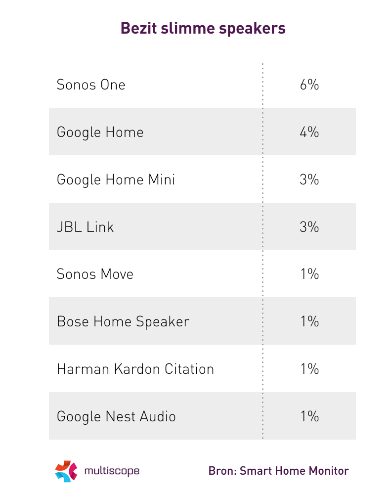 Bijna een kwart van de Nederlandse huishoudens bezit een slimme speaker (23%). Dit komt neer op ruim 1,8 miljoen huishoudens. Het jaar ervoor was dit nog 1,5 miljoen. Gemiddeld heeft men €325 voor de slimme speaker betaald. Doorberekend voor heel Nederland komt de totale marktwaarde uit op €600 miljoen, meldt Multiscope in de vijfde editie van de Smart Home Monitor.