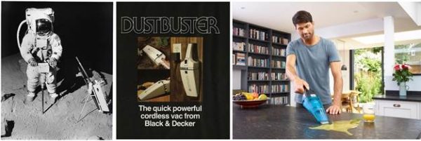 V.l.n.r.:  archieffoto van draadloze boormachine die op de maan tijdens de Apollo II missie werd gebruikt om monsters te nemen, archieffoto van advertentie voor de Dustbuster in 1979, huidige generatie kruimeldieven die ook nat vuil kunnen opzuigen.