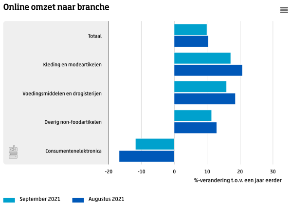 De online omzet van kleding en modeartikelen, van voedingsmiddelen en drogisterijen en van overig non-foodartikelen lag in september 2021 hoger dan in september 2020. De online omzet van consumentenelektronica was echter lager dan in september 2020.