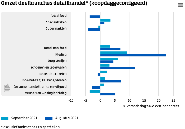 Het omzetherstel van de kleding- en schoenenwinkels zette door in september. Deze winkels hebben opnieuw meer omgezet dan een jaar eerder. Wel was de omzet van de kleding- en schoenenwinkels in september 2021 lager dan in september 2019. De winkels in doe-het-zelfartikelen, keukens en vloeren, de drogisterijen, de winkels in consumentenelektronica en witgoed en de winkels in recreatieartikelen hebben meer omgezet dan een en twee jaar eerder. De winkels in meubels en woninginrichting hebben minder omgezet dan in september 2020, maar meer dan in september 2019.