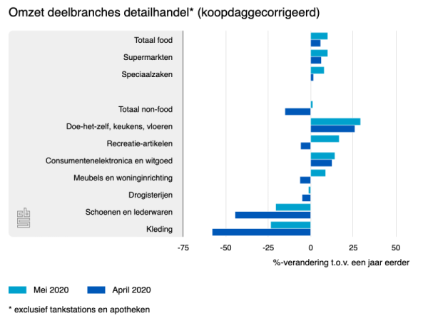 De kledingwinkels en de winkels in schoenen en lederwaren daarentegen leden ook in mei forse omzetverliezen, maar minder groot dan de recordverliezen in de twee voorgaande maanden. Ook de drogisterijen hebben een fractie minder omgezet dan een jaar eerder.