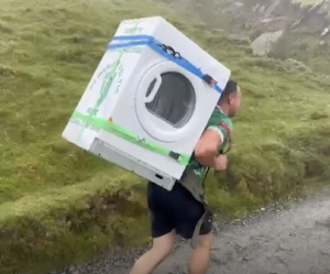 Met wasmachine op de rug de berg op