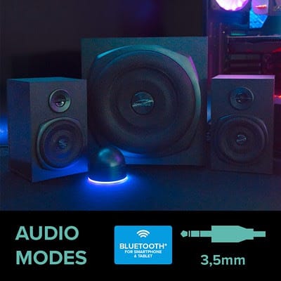 De luidsprekerset is geschikt voor pc’s, laptops, smartphones en tablets, en kan zowel via Bluetooth als via een klassieke AUX-kabel worden aangesloten. De set bestaat uit twee satellietluidsprekers en e