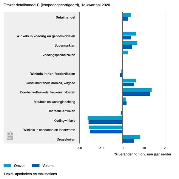 In de foodsector was de omzet in het eerste kwartaal van 2020 6,4 procent hoger, de grootste stijging sinds het tweede kwartaal van 2008. Deze fors hogere omzet kwam vooral tot stand door sterke maartverkopen van supermarkten. Mede als gevolg van hamstergedrag van consumenten was de supermarktomzet in maart 13,1 procent hoger dan een jaar eerder, in het eerste kwartaal was de omzet 6,9 procent hoger.